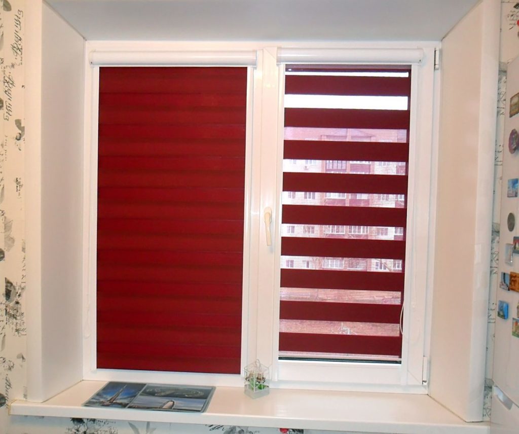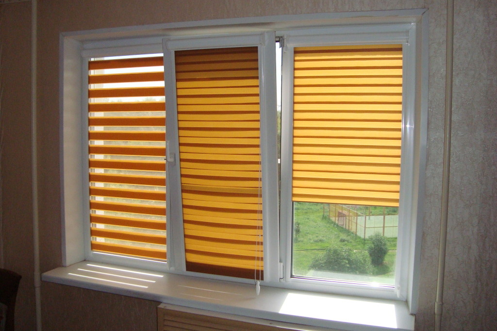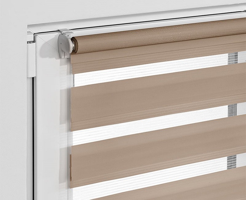 Рулонные шторы"Зебра" системы UNI2 - Штора комплектуется определённой системой на выбор клиента. Специально разработанные кассетные системы рулонных штор «День-ночь» (Зебра) для пластиковых окон(UNI-2). Рулон с тканью спрятан в коробе.При открытии створки в откидном положении ткань не провисает,остаётся вдоль стекла,благодаря держащим её П-образным направляющим, установленным с помощью двустороннего скотча по бокам на штапики. Короб кассетной системы на пластиковое окно можно смонтировать как на двусторонний скотч, так и прикрутив саморезами,которых после установки видно не будет (они скрываются боковыми заглушками.)