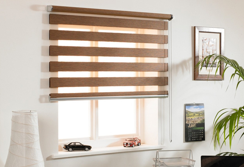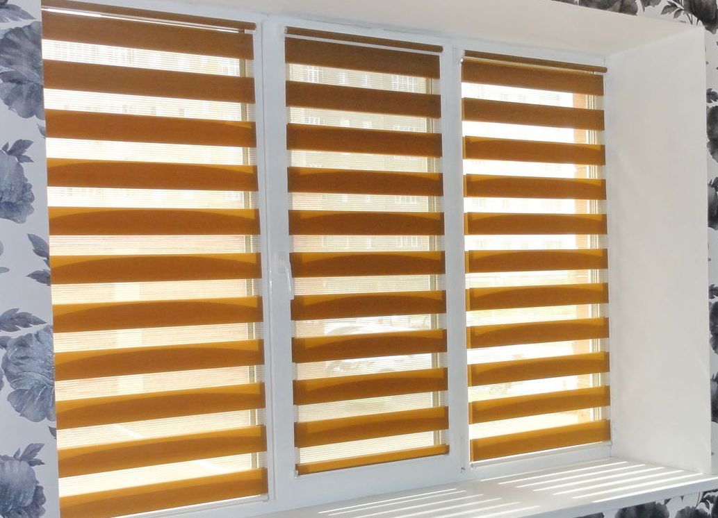 Рулонные шторы «Зебра» – это конструкция, построенная на чередовании двух типов ткани разного уровня светопропускания. Например, прозрачный и полупрозрачный. Они располагаются по принципу горизонтальных жалюзи.
