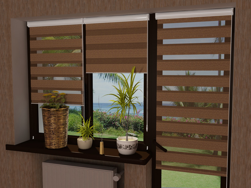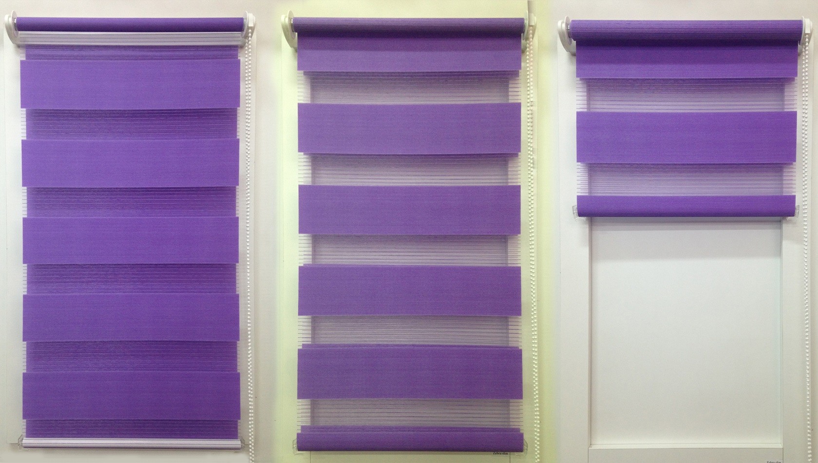 Свободновисящие двухслойные полосатые рулонные шторы.Эта комплектация не имеет направляющих и короба для вала с тканью.На каждом слое чередование плотных полос ткани с прозрачной сеточкой.При совпадении прозрачных полос по уровню обоих слоёв нам открывается вид улицы.При несовпадении штора закрыта.Ткань также можно поднять вверх.